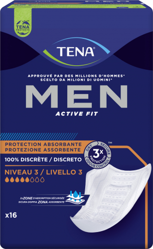 TENA MEN Niveau 3 16 Pièces : Les coquilles pour hommes offrant une protection fiable contre l’incontinence légère à modérée. Coupe anatomique, ultra-absorption, neutralisation des odeurs et adhésifs pratiques pour une vie active en toute confiance.